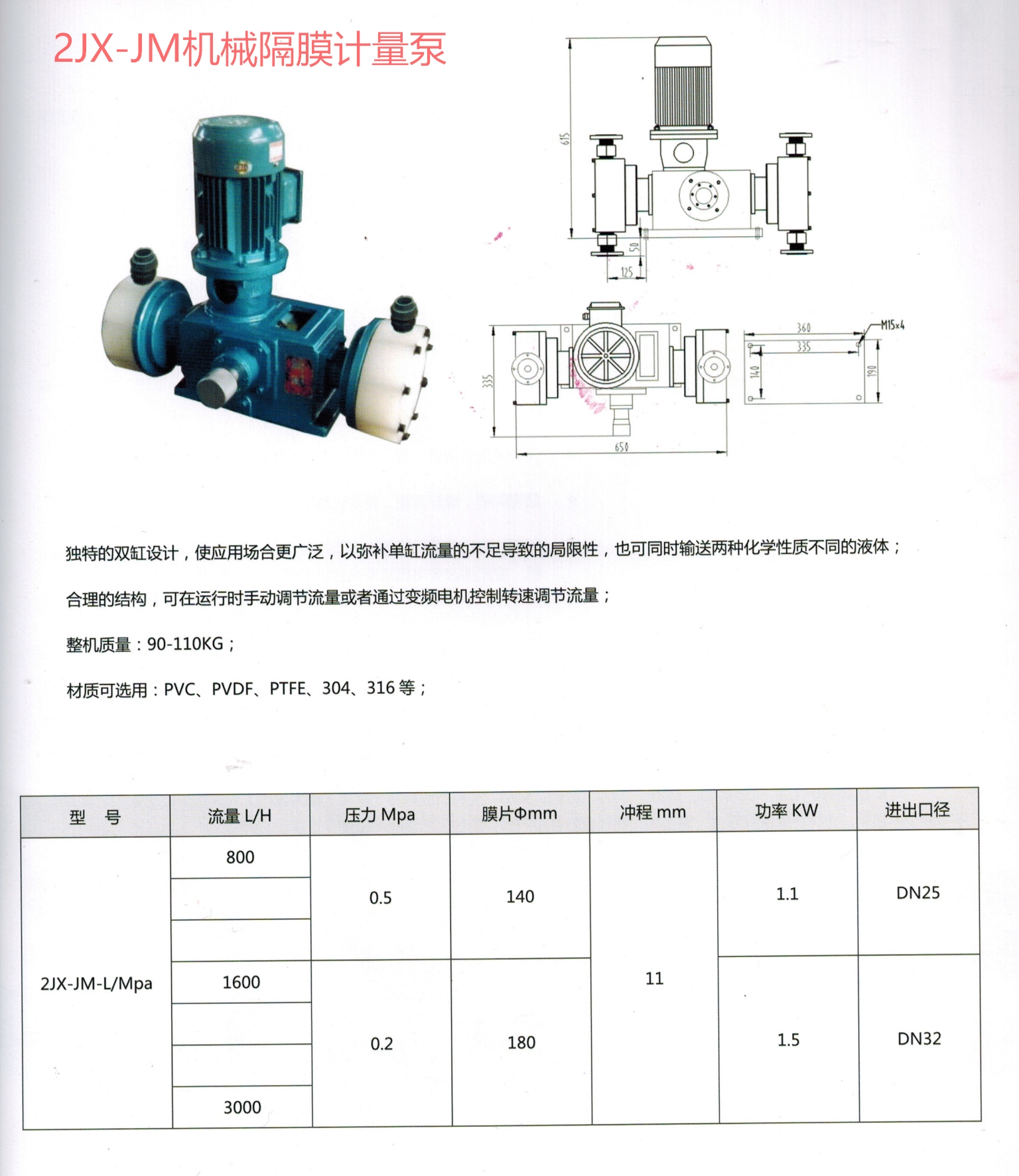 產(chǎn)品信息:2JX-JM機(jī)械隔膜計量泵流量范圍:0-6000L壓力范圍: 0-1.0MPA電機(jī)功率: 0.75KW 1.1KW 1.5KW驅(qū)動系統(tǒng):兩相、三相電機(jī) 防爆 變頻防護(hù)等級